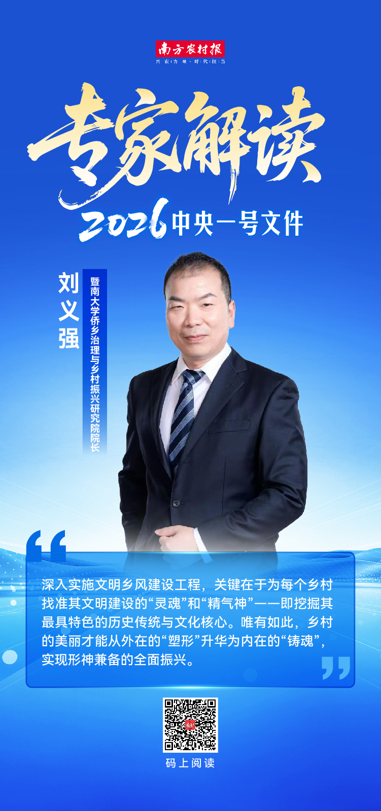 2026年中央一号文献日前发布,锚定农业农村当代化、塌实推动乡村全面振兴规划,对“三农”使命作出系统部署。围绕文雅乡风建设,南边农村报特邀暨南大学侨乡处置与乡村振兴商酌院院长刘义强考验,解读其深切内涵、里面逻辑及实践旅途。