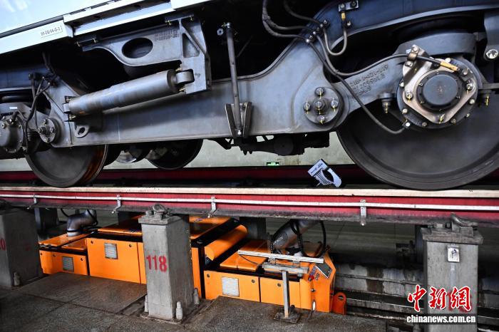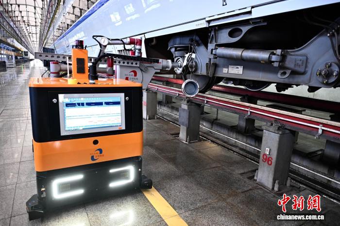 3月25日,位于福建省福州市的福州南动车所内,智能检测机器东说念主正对动车组底部零部件进行全场合扫描。智能检测机器东说念主34分钟即可完成一列动车组车底扫描,举座功课效果提高40%。中新社记者 张斌 摄