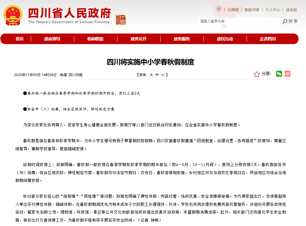 记者留意到,以四川为例,前年11月,四川省教养厅等多部门皆集印发禀报,为深入校家社协同育东说念主,促进学生身心健康全面发展,斗鱼体育中国官网入口在全省实施中小学春秋假轨制。其中明确,春秋假是指在春季和秋季学期中,为中小学生增设有别于寒暑假的短假期。四川实施春秋假顺服“因地制宜、合理成立、协同激动”的原则,尊重区域互异,兼顾学段互异,饱读吹错峰安排。
