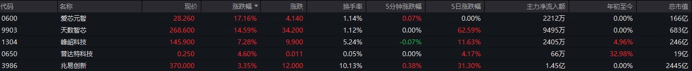 半导体板块领涨,爱芯元智涨超17%,天数智芯涨近15%,峰岹科技涨超8%。