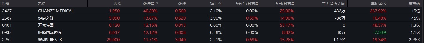 医疗开导与管事板块走强,GUANZE MEDICAL涨超40%,Dafabet健康之路涨近14%,万嘉集团涨超12%。