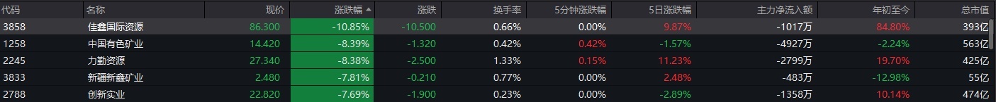 有色金属板块走弱,佳鑫海外资源跌超10%,中国有色矿业、力勤资源跌超8%。