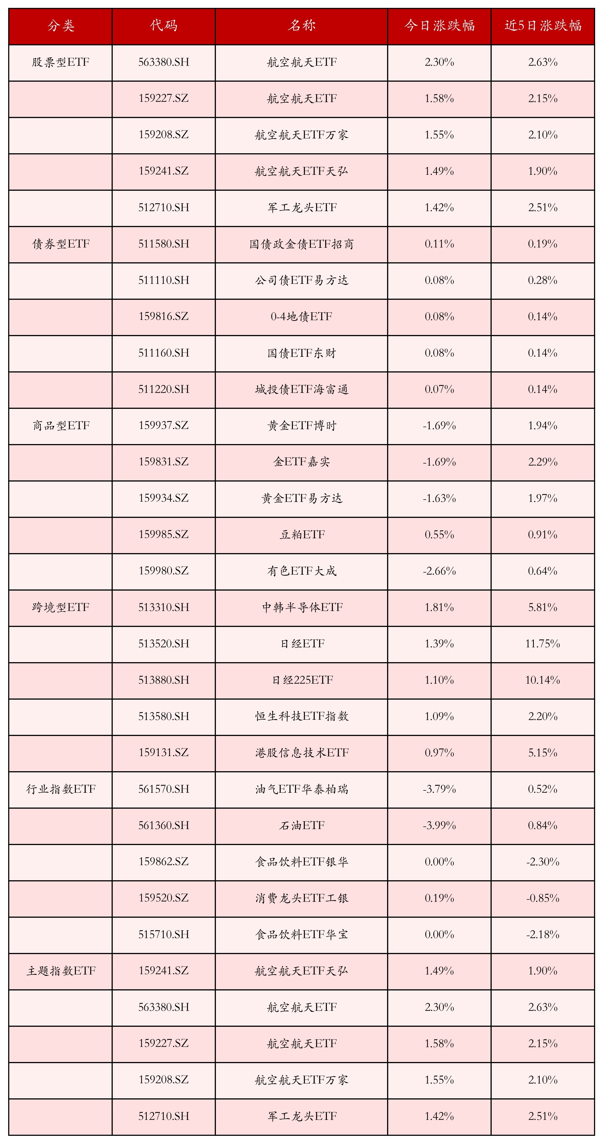 从不同投资种类、行业、主题的ETF居品中找出当天走势行情排行前5的ETF基金,当天涨幅靠前的ETF居品如下表所示。股票型ETF中涨跌幅排行前3位的ETF居品分别为航空航天ETF(563380.SH)、航空航天ETF(159227.SZ)和航空航天ETF万家(159208.SZ),当天收益率分别为2.30%、1.58%和1.55%。