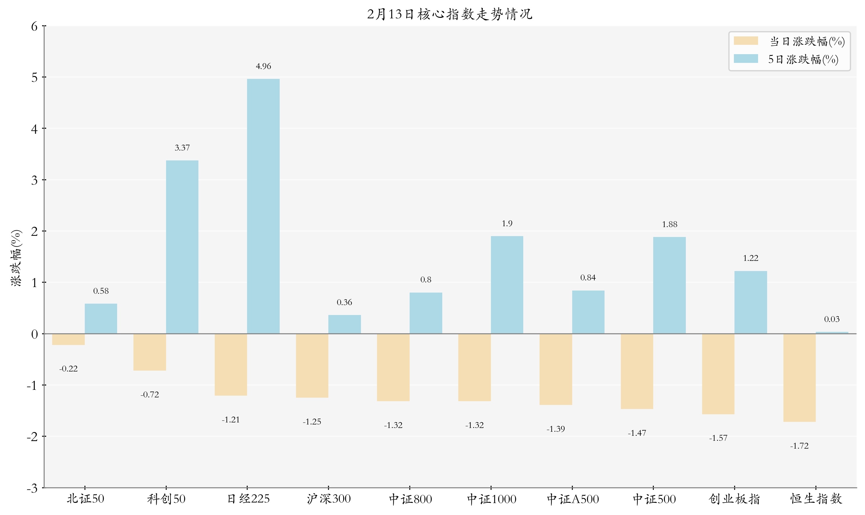 统计A股与国外主要中枢指数走势,当天(2月13日,下同)三大指数集体着落,其中上证指数着落1.26%,斗鱼体育中国官网入口收于4082.07点,日内最高4123.84点;深证成指着落1.28%,收于14100.19点,日内最高14258.83点;创业板指着落1.57%,收于3275.96点,日内最高3323.37点。当天北证50、科创50与日经225走势排行靠前,日涨跌幅分别为-0.22%、-0.72%与-1.21%;近5个来昔时日经225、科创50与中证1000的走势排行靠前,近5日涨跌幅分别为4.96%、3.37%与1.9%。