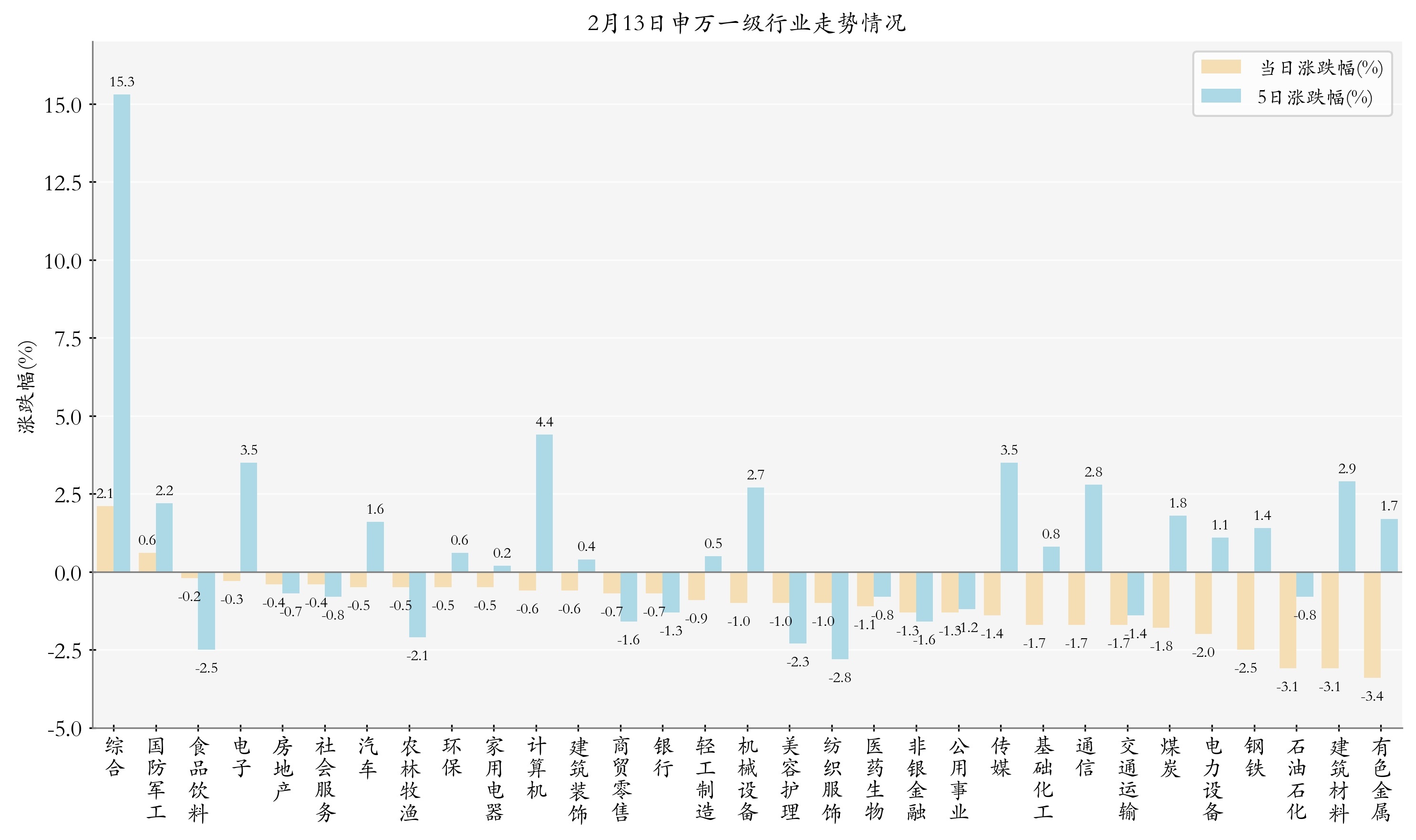 统计当天一皆申万一级行业涨跌幅情况,抽象、国防军工与食物饮料当天走势排行靠前,日涨跌幅分别为2.06%、0.65%与-0.18%,有色金属、诞生材料与石油石化的走势排行靠后,日涨跌幅分别是-3.36%、-3.1%与-3.09%;近5个来昔时抽象、计较机与电子的走势排行靠前,近5日涨跌幅分别为15.28%、4.35%与3.52%,纺织衣饰、食物饮料与好意思容看管的走势排行靠后,近5日涨跌幅分别为-2.77%、-2.51%与-2.33%。