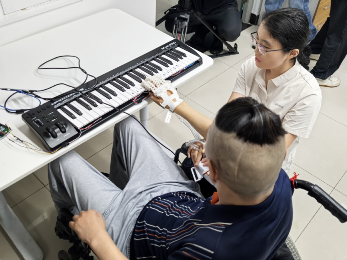 在团队成员协助下,患者尝试熟习脑控弹琴。