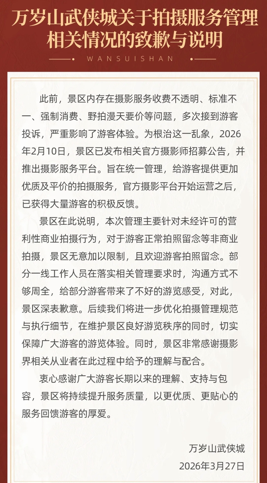 此经管主要针对未经许可的牟利性贸易拍摄举止,关于旅客闲居拍照迷恋等非贸易拍摄,景区意外加觉得止,且迎接旅客拍照迷恋。部分一线职责主说念主员在落实斟酌经管条目时,相易样式不够玉成,给部分旅客带来了不好的游览感受,对此,景区深表歉意。后续咱们将进一步优化拍摄经管模范与践诺细节,在爱戴景区细致游览顺次的同期,切实保险广漠旅客的游览体验。