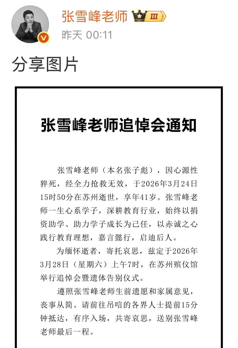 张雪峰微博账号音尘清楚:3月28日将在苏州殡仪馆举行悼念会暨遗体告别庆典。