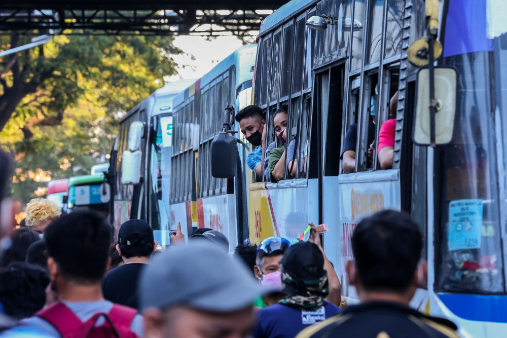 2022年1月17日,东说念主们在菲律宾奎松城乘坐公交车。新华社发(乌马利摄)