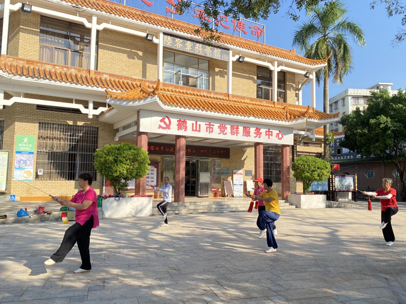 桂林社区党委依托党群工作中心培植孵化跳舞、赞扬、曲艺等20余支文艺志愿戎行。图为居民在党群工作中心广场开展晨练。江门市委组织部 供图