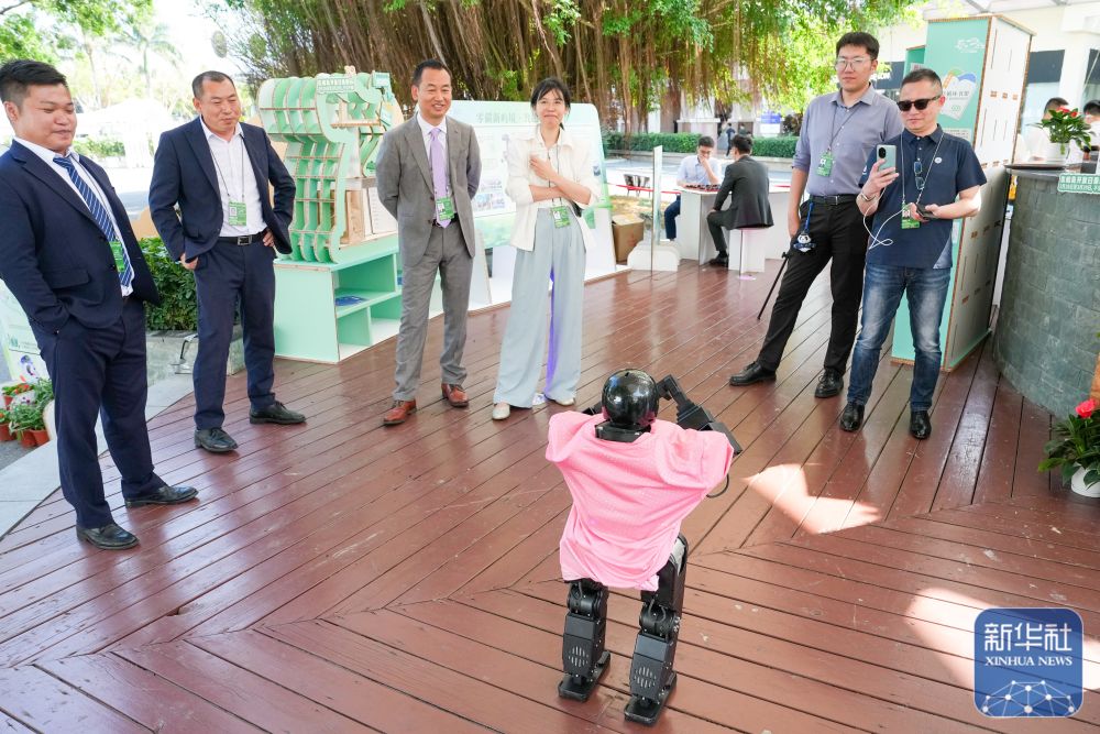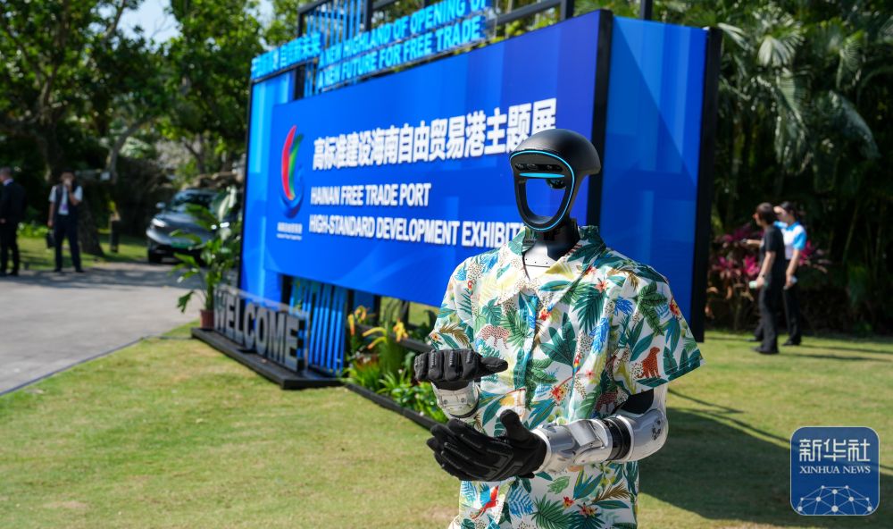 ↑ 3月24日,东说念主形机器东说念主在位于海南省琼海市博鳌镇东屿岛的高程序建造海南解放交易港主题展上迎宾。