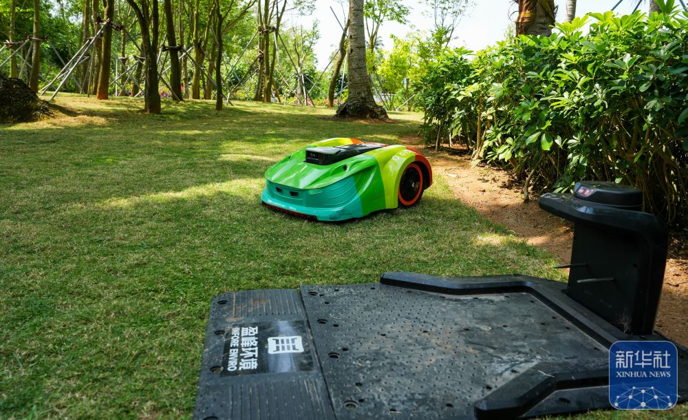 ↑ 3月25日,智能无东说念主割草机在中国(海南)南海博物馆支配草坪上功课。